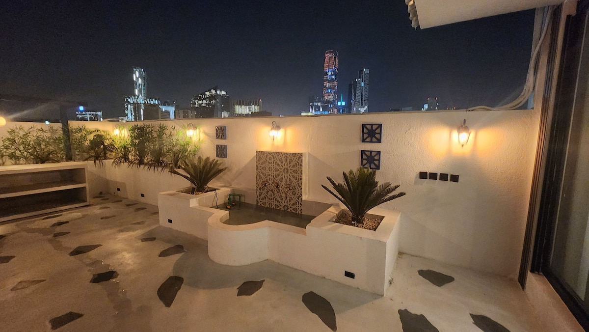 Luksuzan dvosoban stan sa privatnim đakuzijem na krovu u Al Malki, u severnom Rijadu. Uživajte u elegantnom smeštaju sa 75-inčnim QLED pametnim televizorom sa Netflix-om, Disney+-om, Shahid-om i OSN-om. Krov nudi predivan pogled, prostor za sedenje na otvorenom i sistem za raspršivanje hladne magle za osvežavajuću atmosferu. Brzi Wi-Fi preko optičke mreže, aparat za kafu, električna rerna i samouslužni ulazak. Savršeno za parove i opuštajuće večeri na krovu.