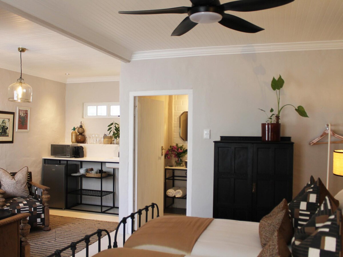 Nestled in the charming historic district, our quaint granny cottage awaits you within strolling distance of delightful restaurants and popular tourist attractions. Set in a lush garden, this kitschy gem ensures absolute privacy, creating a tranquil retreat for your stay. A pool, garden patio, Wi-Fi, basic kitchenette, bathroom with both bath and shower, air conditioning, free parking, inverter, a luxurious king size bed and a charming fireplace - what more could one wish for?