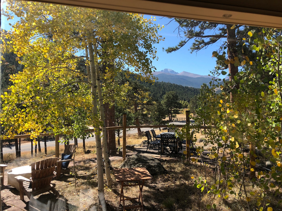 (#3358) Our tiny but mighty, beautiful and clean cottage home is in a friendly neighborhood with amazing Lake Estes and mountain views, is a 0.7 mile walk to Downtown, is a few blocks from local breweries or the EP Event Center, is a 10 min. drive to RMNP, has WiFi up to 1 Gbs, has amazing sitting by the fireplace views of Lumpy Ridge Mountains and Lake Estes or amazing sitting in the hot tub views of Twin Sisters Peaks. And, has a FREE Tesla charger!