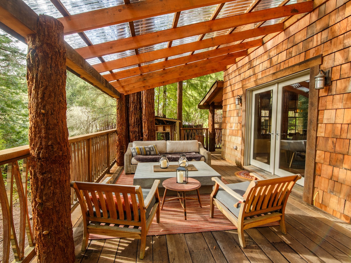 Izgrađena 1948. godine pored potoka, ova istorijska botaničarska koliba stvorena je za jednostavan život i duboku povezanost sa prirodom. Osvetljen i intiman, studio je obložen prozorima koji unose šumu u zatvoren prostor, sa kompletnom kuhinjom, kadom za kupanje i tušem na otvorenom. Okruženo sekvojama, jezerom sa ljiljanima, vodenim vrtom i stazama za lutanje, ovo je retko mesto za usporavanje, isključivanje i doživljavanje nečeg zaista jedinstvenog u Tri Riversu.