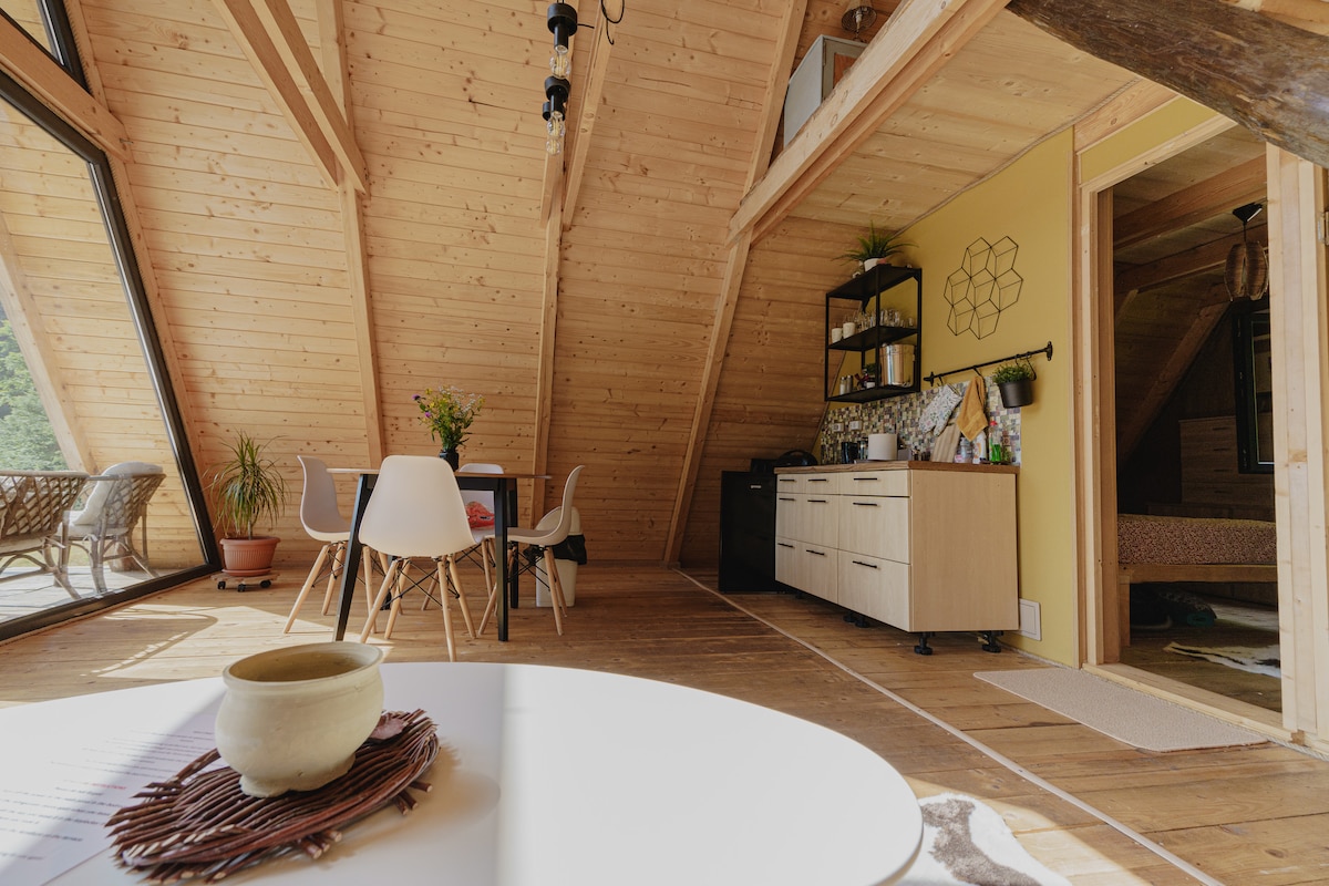 A Frame Cabin - Valea Vinului is located in the Maramureș Mountains Natural Park (the second largest area in Romania), on the Wine Valley, part of the city of Viseu de Sus, the street being recognized for the richness of mineral springs. The cottage is located in a place with an unforgettable panorama, overlooking the spectacular hills and the Rodna Mountains. The cottage is located away from the main road, enjoying peace and privacy.