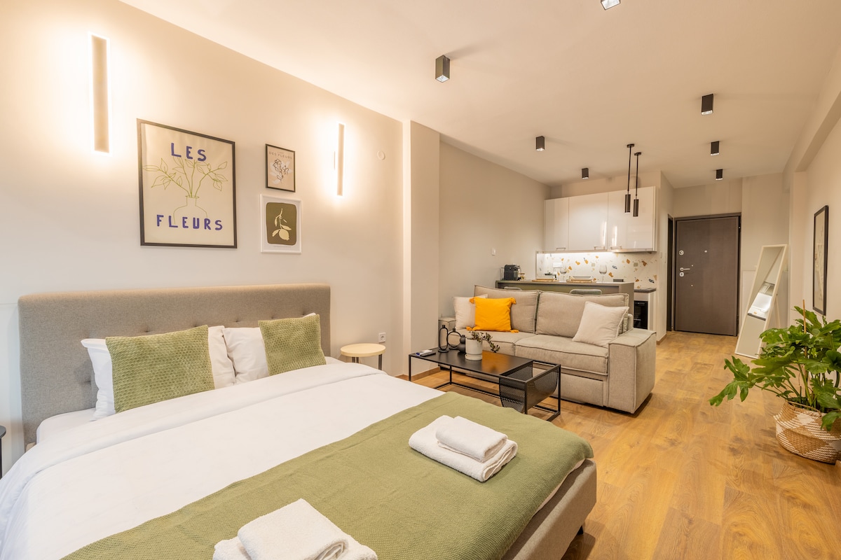 Unique 1 Bedroom fully equipped apartment on the seventh floor of a 2020 renovated building with a breathtaking terrace balcony. High speed internet, premium amenities, a luxurious queen size bed, and your very own Netflix account are but a few things we offer you. Luminous, spacious, with everything you might require to enjoy your stay in the heart of Thessaloniki's social life, only 5 minutes away from Aristotelous square and 2 minutes from the seafront. Welcome and enjoy your stay!