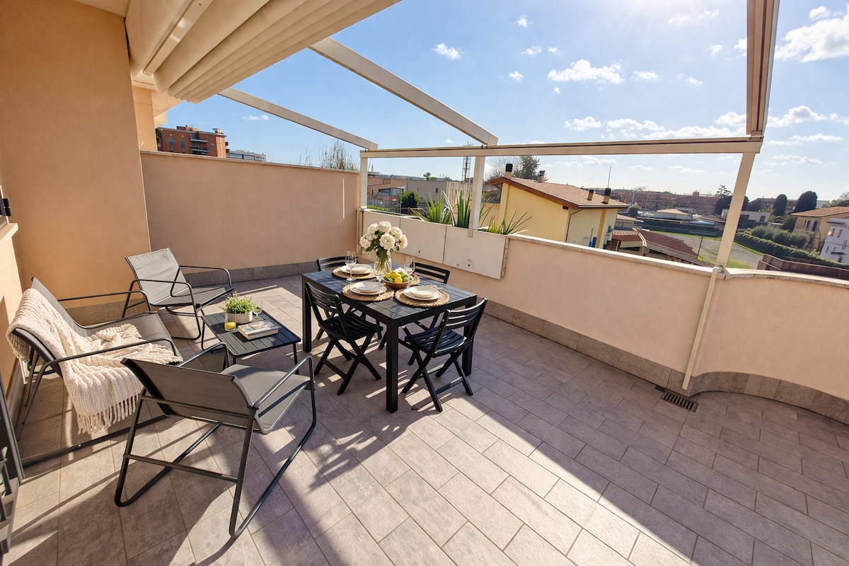 -Bright apartment with a large private terrace, located in a quiet yet well-connected area. -Just minutes from Metro A (Anagnina) with direct access to the Vatican, Spanish Steps, Trevi Fountain, and historic center. The Colosseum is easily reachable via Metro B. -Equipped with fast Wi-Fi, Smart TV, air conditioning, self check-in, and free private parking. -Strategically located near Tor Vergata University and Hospital, Ciampino Airport, and Capannelle Hippodrome.