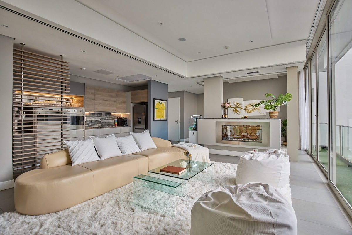 Indulge in the ultimate luxury at this immaculate 2 bed, 2.5 bath 12th floor penthouse, located steps away from Rosebank mall. The bedrooms both feature King XL beds, smart TV's, en-suite double vanity bathrooms with bathtub and walk in showers, while the living area boasts an 85" TV, gas fireplace, 6 seater dining table, and a balcony with built a built in braai. The kitchen is fully equipped for self catering guests, and the whole apartment is covered by AC and 500mbps Wi-Fi. No loadshedding.
