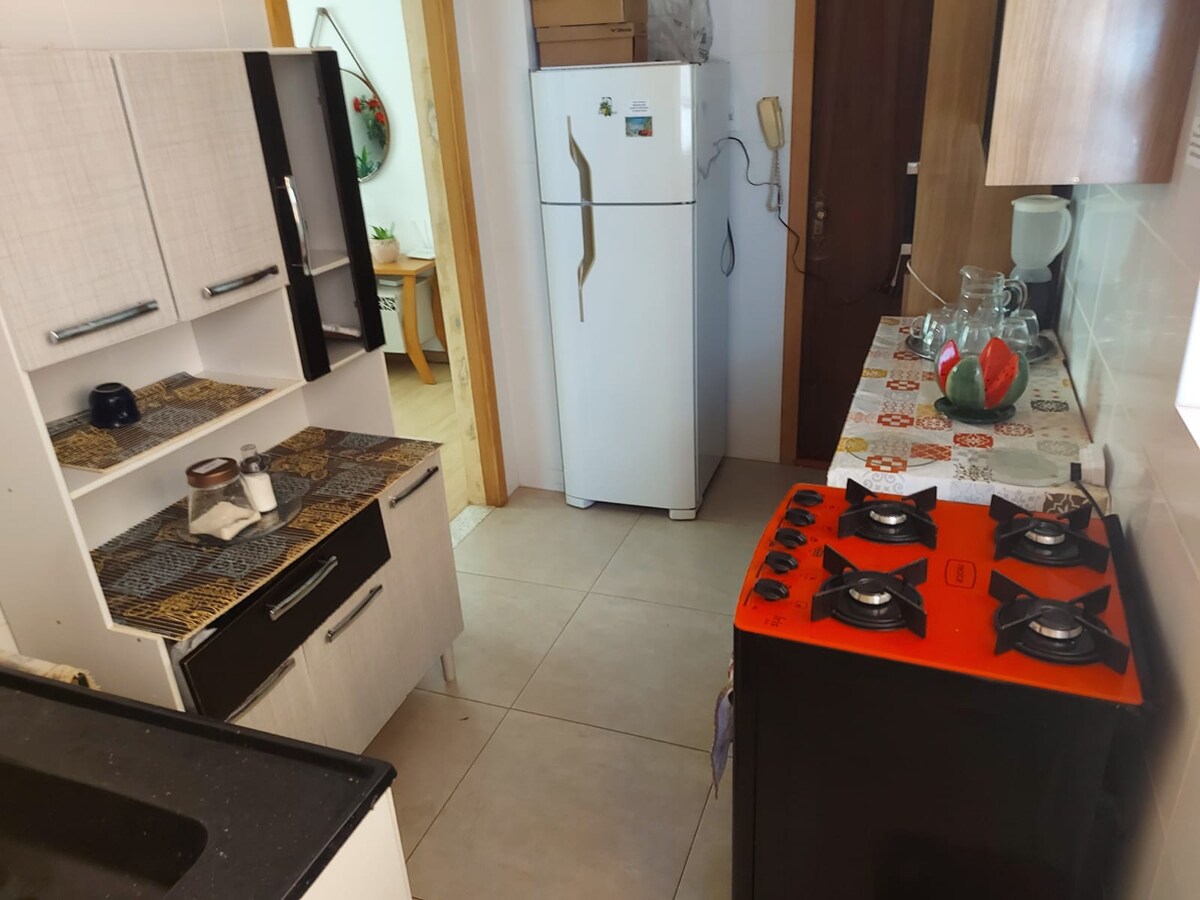 Curta uma experiência elegante neste lugar bem-localizado. Apto dividio em sala, cozinha e suite, que comporta até 04 hospedes e 01 vaga gar. Sala: 01 Sofa cama casal 01 Tv 32" smart Cozinha: 01 Geladeira 01 Fogão a gás 01 Forno a gás 01 Microondas 02 Banquetas altas 01 filtro de água anexo a torneira Louças e talheres para 04 hospedes Armarios embutidos Quarto: 01 Cama casal Ortopedica com massagem Armarios embutidos Ar Condicionado quente/frio Jogo de cama Travesseiros Wifi disponível