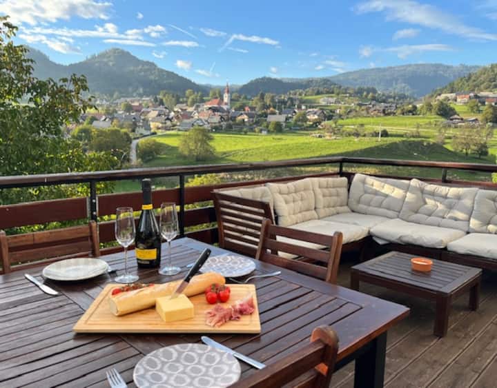 Seoski dom u blizini jezera Bled sa pogledom na planine.