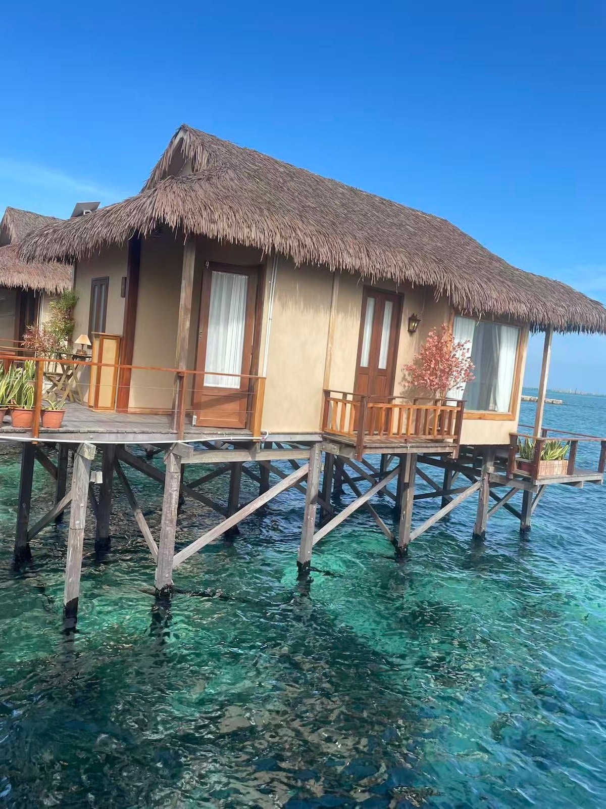 马布岛海龟湾度假村特色: 1:打造了三个带茅草屋顶的阳台,目前是仙本那水屋少有的特色。 东边阳台迎晨阳、通风佳。 南边阳台采光足、日照久。 西边阳台享落日、纳晚风。 三个朝向的阳台搭配茅草屋顶,利用自然光影和风源,让房屋多区域实现通风采光的互补,不同时段都有舒适阴凉的休闲空间; 2:整体设计风格采用自然风,打造高级的同时还具备温馨浪漫色彩,让住宿者随时拍出马尔代夫式的度假大片 度假村以整体采用开放式布局的自然风格, 材质多采用木、棉、麻、泥巴等天然材料,身体与这些天然材料的触碰、能让人松弛又有味道,成为情绪避风港 屋顶采用茅草,茅草自有隔热与透气的优点同时给整个房屋的外形营造自然质朴的高级氛围感 3:地理优势 度假村紧临仙本那天花板的 Mwb 度假村,入住期间可以避开高峰期的一日游人群,随时凹造型不被游客打扰
