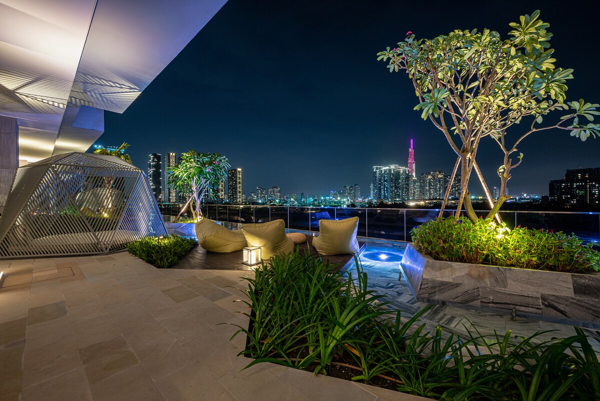 Spacious Duplex | 4 Ensuite Bedrooms | Private Rooftop Pool HORIZON HAVEN Our home is a 2-story suite that comfortably hosts up to 8 guests & children. It features its own entrance, pool, garden, & kitchen—yours to enjoy. Located in a quiet, upscale neighborhood in District 7, the duplex sits in a building with just 1 other unit. Step outside to a peaceful park and scenic eco lake. Within walking distance, you’ll find a variety of restaurants, cafés, spas, & LOTTE supermarket.