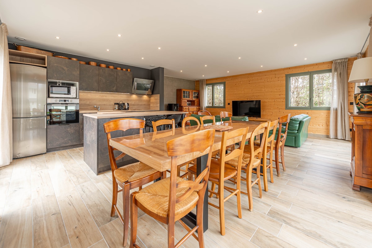 Potpuno renovirana kuća za porodični odmor. Smješten 200 metara od jezera i biciklističke staze, možete uživati u privatnom, zatvorenom i bezbjednom parkingu za svoje vozilo. Na raspolaganju je ograđena i šumovita površina od 1000 m2 sa hidromasažnom kadom, terenom za kućne ljubimce, trampolinom, roštiljem i ljuljačkom. Dekorativni vodeni bazen, bez plivanja. Veliki dnevni boravak sa toplom atmosferom zahvaljujući drvenoj dekoraciji učiniće vaš boravak još mirnijim.