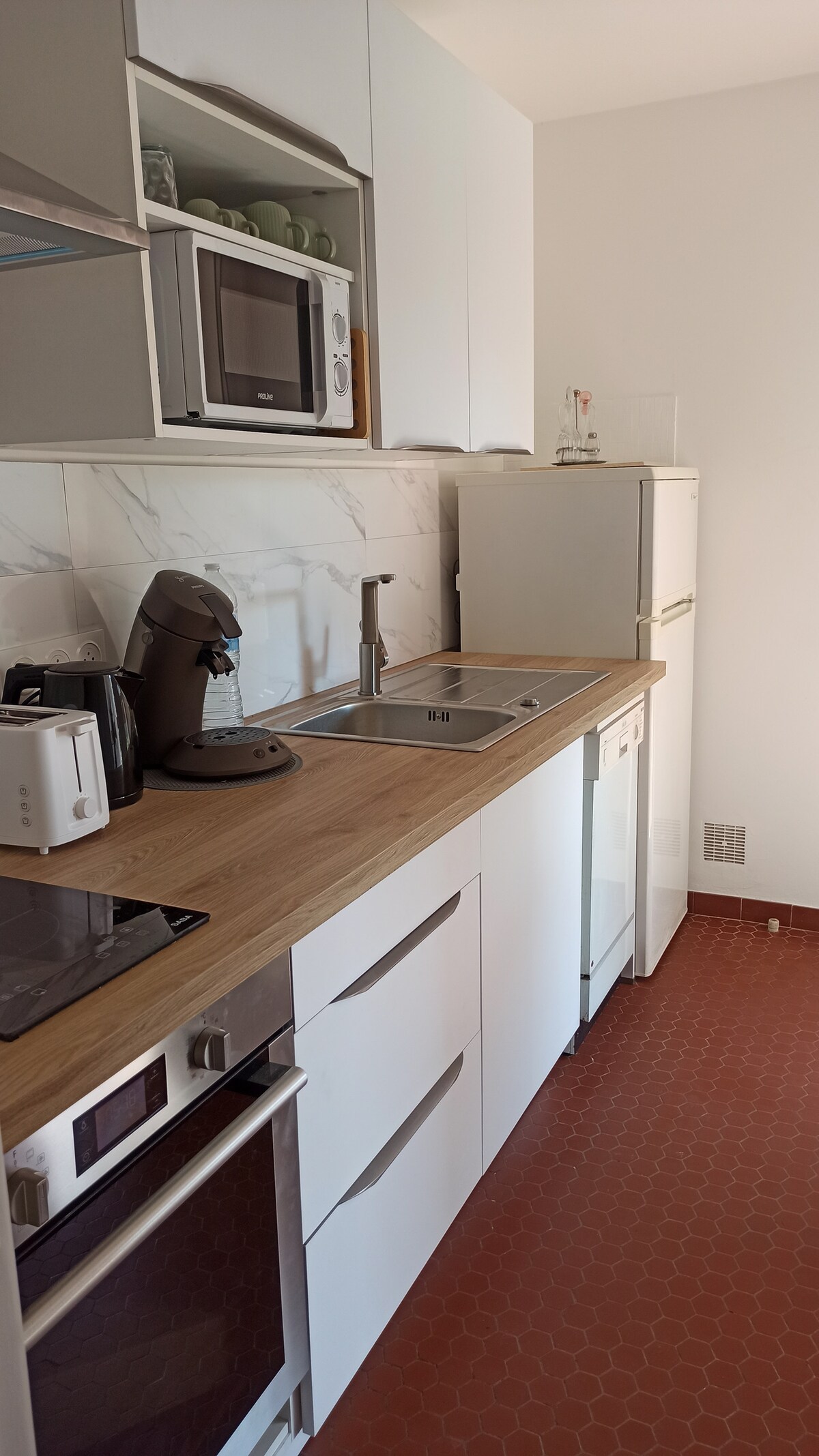 Stan T2, potpuno renoviran , vrlo svijetao, sa divnom terasom sa pogledom na more, u rezidenciji sa bazenom 20 metara od mora pješke - 1 odvojena spavaća soba, posteljina, krevet od 140 cm, TV -SDB sa kadom, peškiri su obezbeđeni -WC - ulaz sa ormarom - Potpuno opremljena kuhinja (mikrotalasna rerna, aparat za kafu Senséo, frižider/zamrzivač, šporet sa 4 ringle, rerna, toster, mašina za pranje sudova, mašina za pranje veša) - Dnevni boravak, krevet, brzi kauč 140 cm, TV, Wi-Fi - Terasa s pogledom na more i planine sa stolom i stolicama.