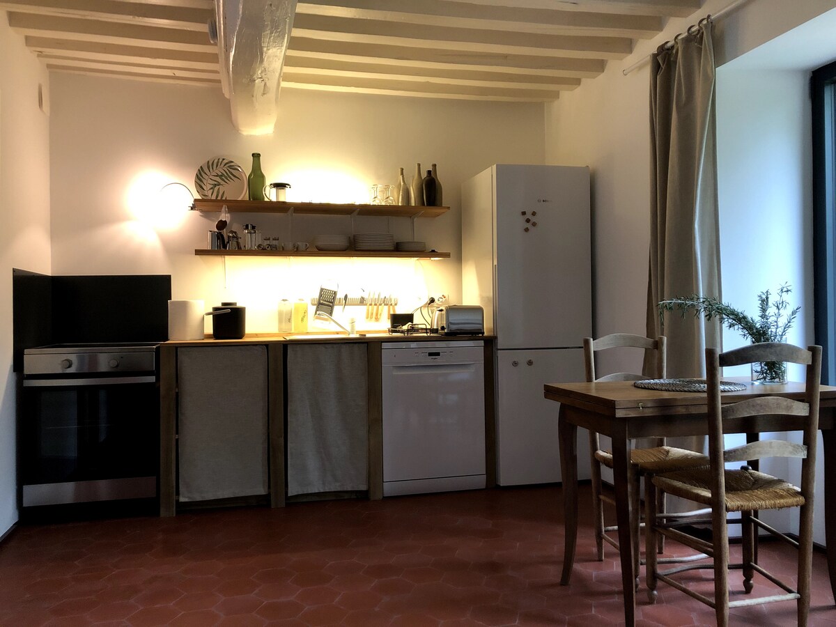 Hladan, udoban i prostran (90 m2) smještaj na 2 sprata. Velika kuhinja , salon i terasa na nivou ulice i fantastična 1 dvokrevetna soba otvorenog tlocrta na 2. spratu. Preuređeni grange smješten na planini u srednjovjekovnom selu 16 minuta od A6, ovaj mirni dom je idealno mjesto za odmor na Alpima ili jugu Francuske. Imajte na umu - u donjem prizemlju se nalazi studio apartman sa sopstvenim ulazom - iznajmljuje se zasebno.