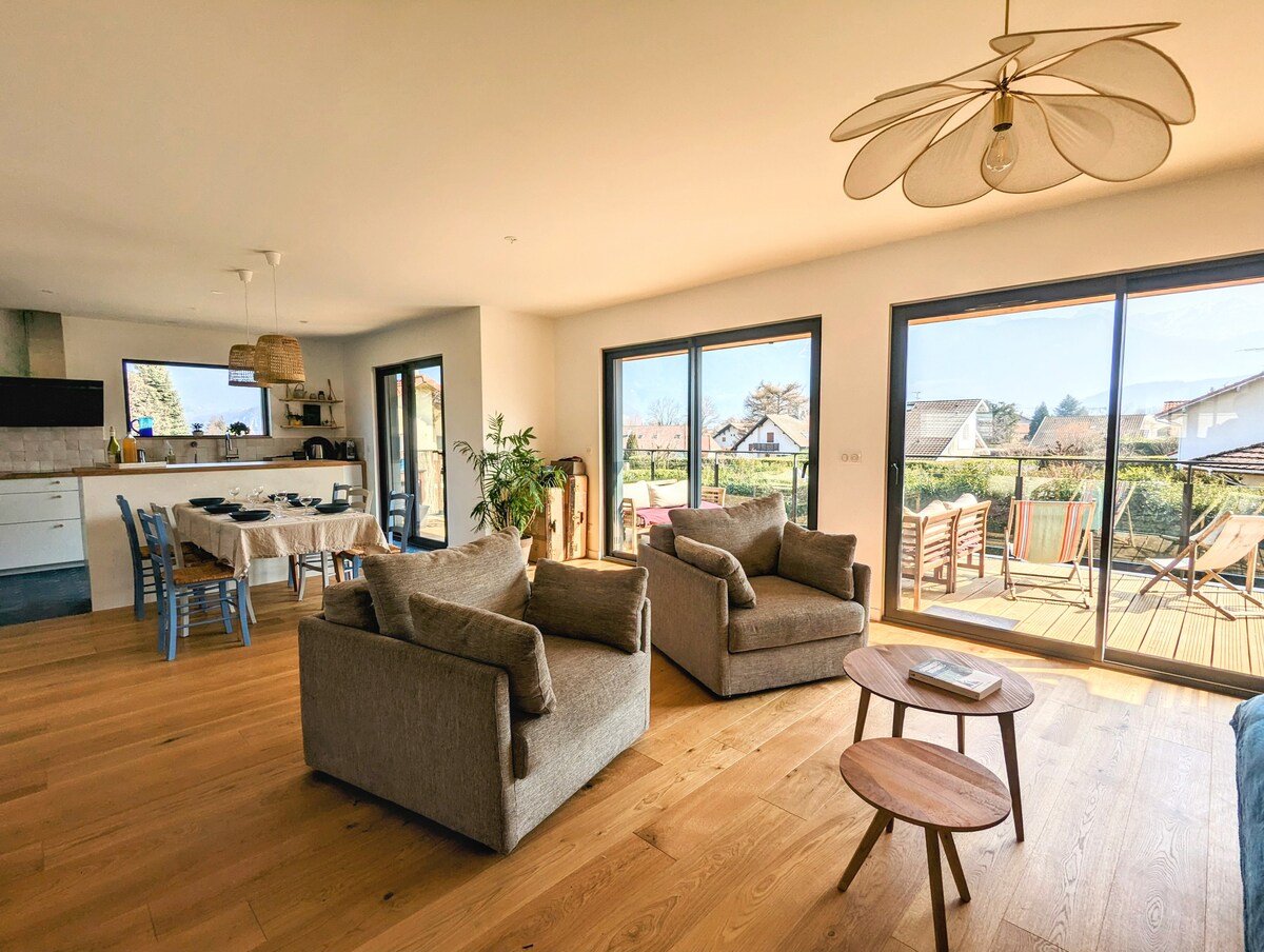 Welcome to our wooden house built in 2022, ideally located between Lake Annecy and the town of St Jorioz. Lake and shops accessible between 5 and 10 minutes on foot or by bike. Enjoy a magnificent view of the mountains from the large terrace. Bike path just down the alley. Access to Annecy by the cycle path (9km along the lake), by car (15 mins) or by bus (direct line from the train station). House for 6 people and optional adjoining apartment for 2 people (enter 8 guests in the booking).