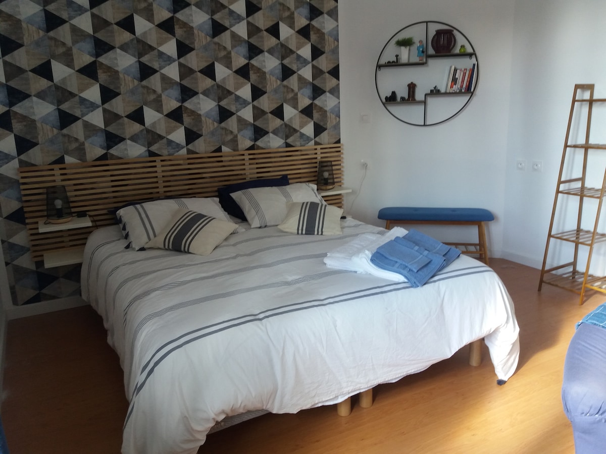 Chambre calme, spacieuse au 1er étage de la maison pour 2 adultes, avec balcon, lit 140cm, bureau, salle de bains privative à l'étage. WC séparé. TV dans la chambre parentale et accès WIFI . Le Petit déjeuner et tout le linge de maison sont compris sans supplément. Une 2ème chambre pour enfants ou ado avec 2 lits 90x200 est disponible avec réservation anticipée auprès d'Airbnb ( 30 euros par personne et par nuit, petit déjeuner compris). La salle de bains est alors commune pour la famille.