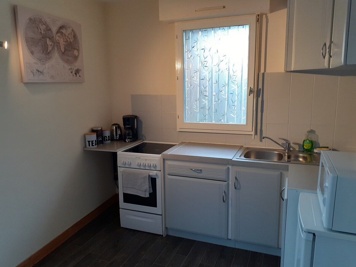 Studio od 28 m² sa 3 zvezdice, na prvom spratu naše samostalne kuće, sa nezavisnim ulazom sa spoljašnjeg stepeništa. Potpuno opremljena kuhinja: indukcione ploče za kuvanje, kombinacija rerne/mikrotalasne rerne, veliki frižider, mašina za pranje sudova, aparat za kafu i Dolce-Gusto aparat za kafu. Toaletni prostor sa tušem. Zaseban toalet. Ormar i skladište Možete da uživate u bašti sa stolom, stolicama i sunčanjem. Idealna lokacija, na 5 minuta od centra grada i na 5 minuta od železničke stanice.