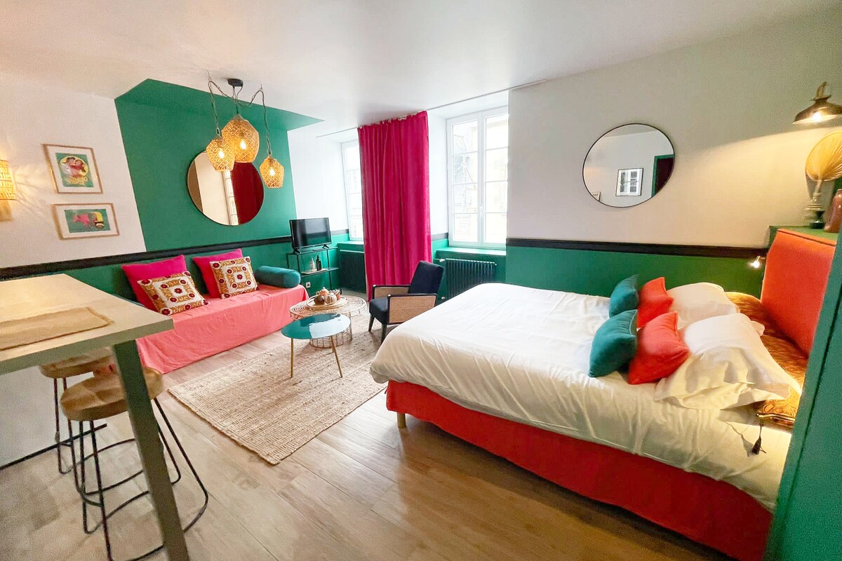 Welcome to India, minus the sound of horns! A remedy for melancholy, this vast 30 m² studio located on the 2nd floor of the Cité Solidor transports you to the colorful world of Bollywood studios. Located on an exceptional site (the City of Aleth), this pretty studio is located a few steps from the beach of Solidor and that of the lower Sablons, all just 15 minutes on foot from the intramuros.