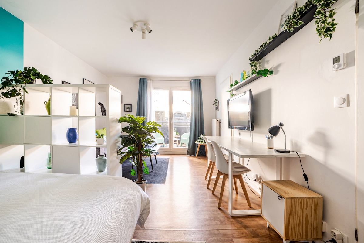 Découvrez ce grand studio très bien équipé et décoré avec soin sur le thème des tropiques. Il ouvre sur une terrasse meublée. Vous disposez de la WIFI et NETFLIX. Vous avez accès à un PARKING PRIVE sécurisé et gratuit. L’appartement est situé au RDC dans une résidence calme et SECURISEE par une vidéosurveillance. Il est à 13 minutes à pied ou à 5 minutes en bus de la gare qui dessert Paris en 35 minutes. Pour aller au centre ville, vous avez le bus à 1 mn à pied ou le train à 10 mn à pied.