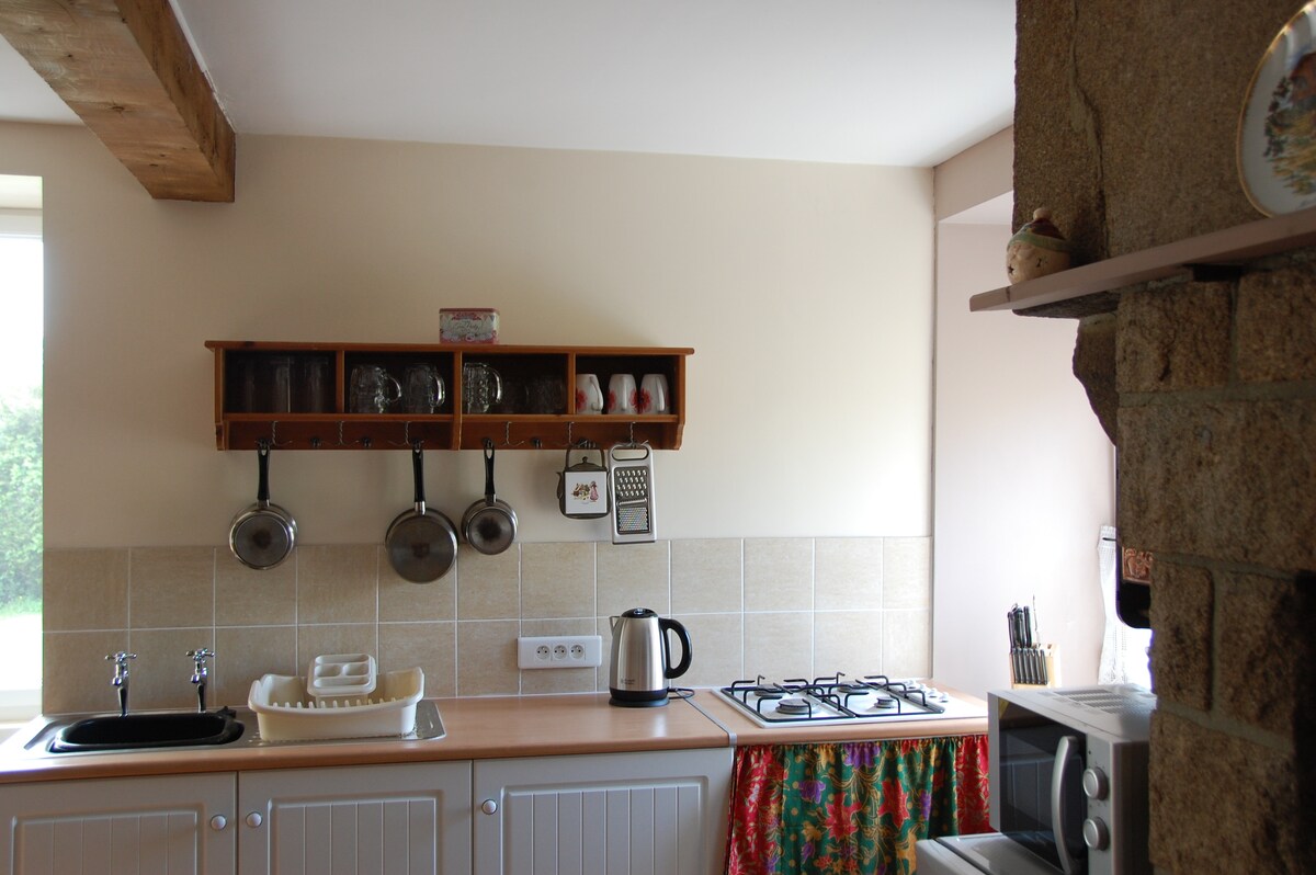 We are located in rural Normandy, France, 500m from a small village. Our home consists of an original house and attached larger house. We live in the larger house and it is the original house which is the accommodation offered here. The accommodation has its own entrance and is separated from our house by thick stone walls. There is a living room at ground level with a corner kitchen and upstairs is a bedroom with en-suite bathroom. It is a very quiet location.