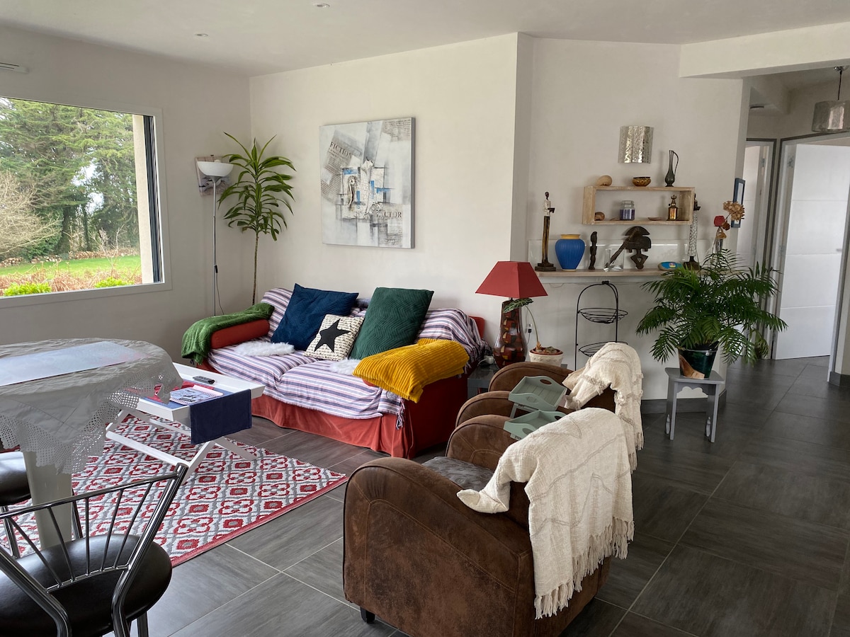 Kuća je pored mora, moderna i smeštena na predivnom Ile Grande, okrenuta ka ostrvu Aval, u blizini Peros Gireka, Ploumanaha i Tregastela. Glavna soba ima pogled na more zahvaljujući velikim prozorima. Kuća je okružena privatnim vrtom. Uživajte u udobnosti moderne kuće i idealnoj lokaciji na „cote de granit rose“. Pešačka staza pored mora koja ide oko Ile Grandea i plaža Tul Gven su pored kuće.