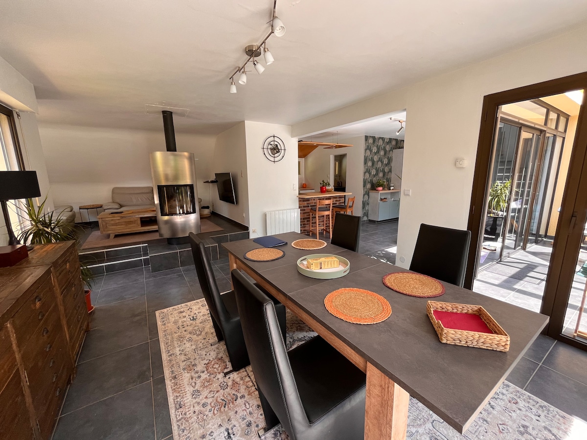 "Chez nous, vous êtes chez vous". Le logement est confortable, cosy, et spacieux. Il est très bien équipé. Vous pouvez profiter du jardin fleuri en fonction de la saison, ainsi que des terrasses. Quiétude après vos ballades. Vous aurez l'impression d'être à la campagne, tout proche du centre d'Avranches, petite bourgade agréable,riche d'histoire liée au Mont Saint Michel. DRAPS ET SERVIETTES INCLUS DANS LA PRESTATION