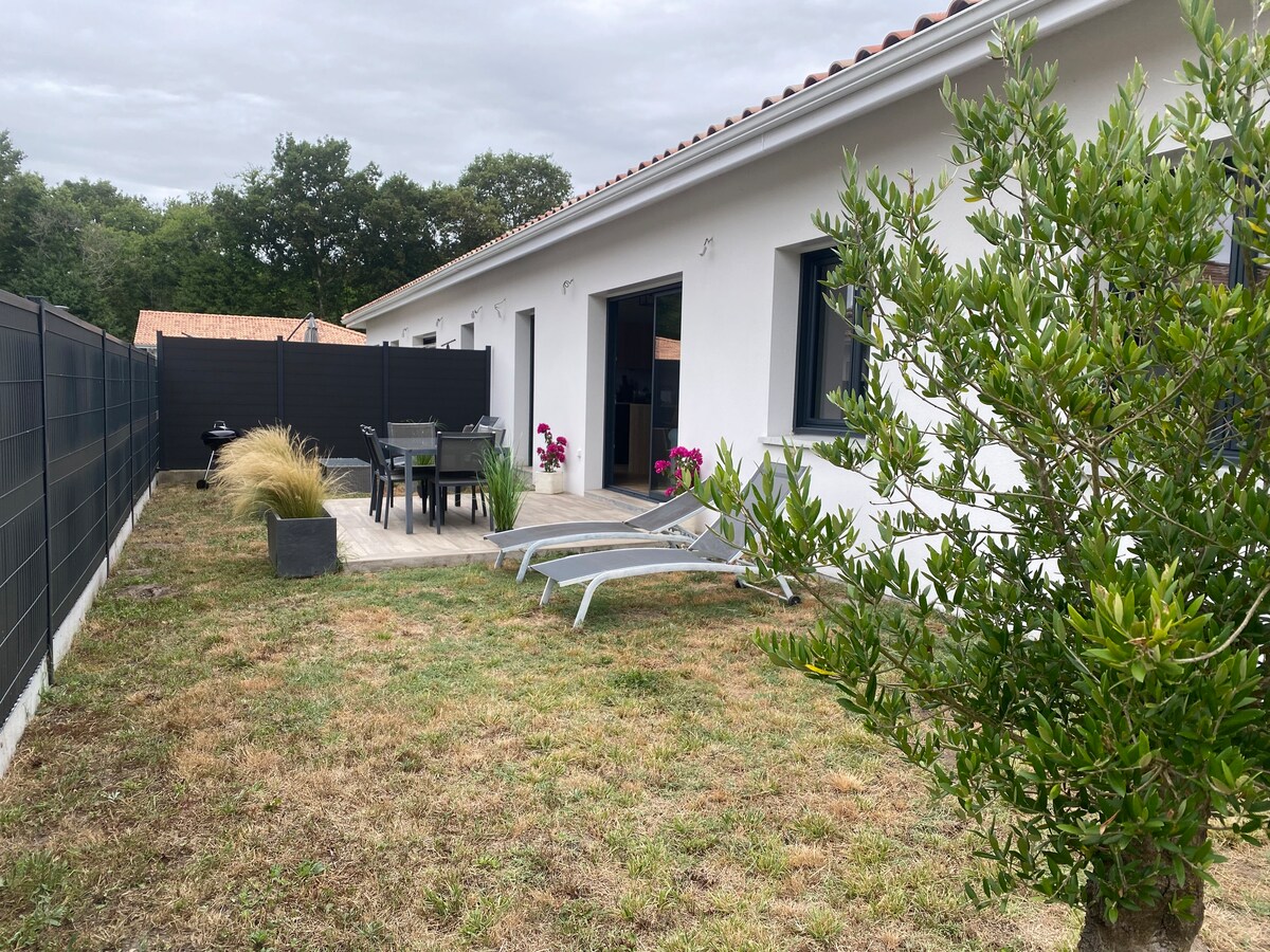 Maison neuve entourée de forêt à côté de la piste cyclable et plages de la côte landaise Elle se compose d’un salon avec cuisine américaine, de 3 chambres dont 1 suite parentale avec sdb et wc , pour finir une autre sdb et wc indépendant . Fibre internet 🛜 Pour l’extérieur une piscine pleins sud de 4 sur 8.5 m chauffée de avril au 11 novembre avec jardin paysager et 110m2 de terrasse en bois . Plage et golf de Moliets et maa à 10mn Vieux boucau 15mn Hossegor 28mn . Biarritz 50mn