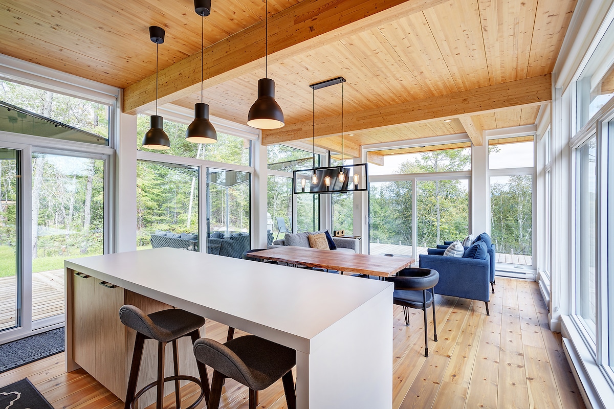 A calm lake chalet in wood, between two regional parks, minutes walk from nature trials and off the beaten path. East windows let the happy morning light on natural materials and heated floors. In the evening, a cozy cinema with ambient sound by a fireplace, a second media room with a turntable ideal for music. Outdoors, a hot tub, a wood-burning sauna, a fireplace by the lake and a slide. Cross-country ski, snowshoe trails are minutes’ walk, and snowmobile routes start right at the driveway.
