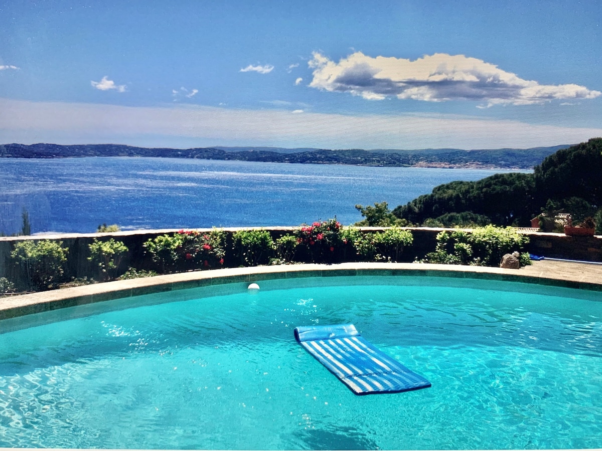 RARE IN SAINTE-MAXIME: Villa NEAR THE CENTER, SEAIDE. Grijani bazen na zahtev. PANORAMSKI POGLED NA MORE. Nedavno renovirana vila od 160 m². + 1000 m² zemljišta. Bašta, sto za stoni tenis, roštilj, parking, klima-uređaj, TV i WI-FI... 5 spavaćih soba (tiha, kvalitetna posteljina) + 2 kupatila. Pet minuta hoda od centra Sent Maksimea i 5 minuta od plaža. Pristup obali za prelijepe šetnje i plivanje. Uključene usluge: čišćenje na kraju boravka, posteljina za domaćinstvo i bazen.