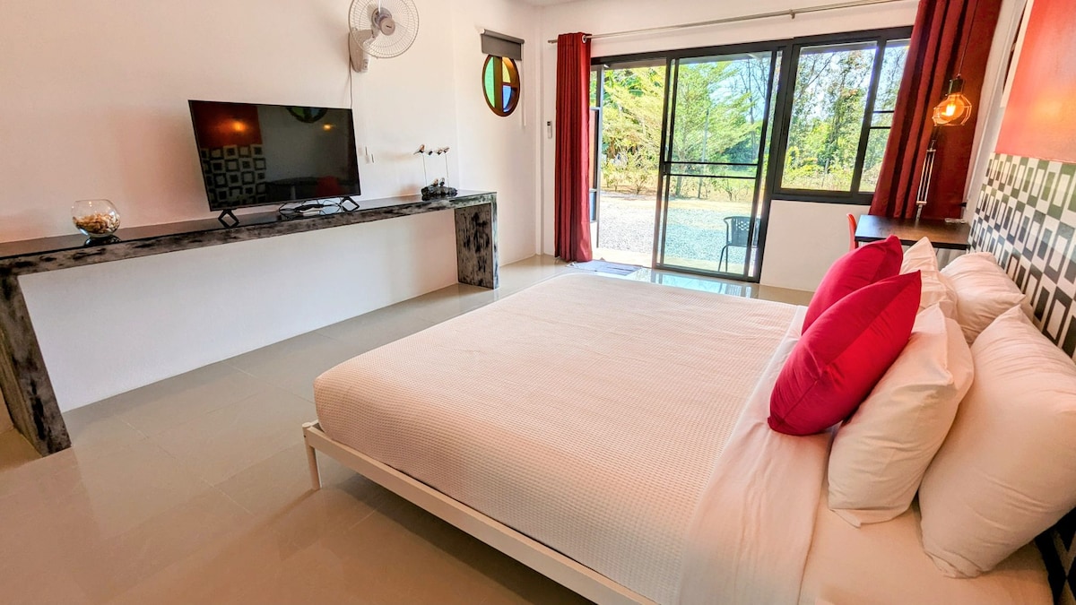 Spremno za rad na daljinu sa radnim stolom, Wi-Fi-jem od 600×600 Mb/s, 2 tihim klima-uređajima, pametnim TV-om, privatnom terasom od tikovine i čajnom kuhinjom sa indukcionom pločom. Tih, moderan, minimalistički, blizu prirode. Pešačite do plaže Klong Čak za manje od 10 minuta; preporučuje se skuter/taksi za istraživanje. Ova rezervacija je za smeštajnu jedinicu B (srednju) u Cascade Hills Bungalows.