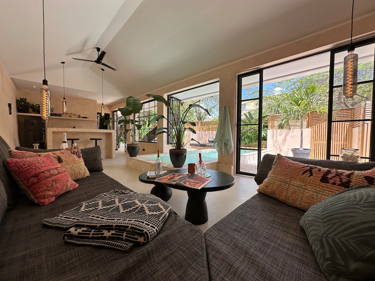 Welcome to Terra, a one-bedroom retreat at Villa ZEN Haven, where earthy elegance meets island serenity. Terra is the perfect blend of nature, comfort, and luxury - minutes from Curaçao’s most stunning beaches. Designed with warm wood tones, rich neutrals, and natural textures, Terra offers a grounding and peaceful ambiance. The bedroom features a plush queen-size bed, uniquely designed by an artist, while the modern en-suite bathroom with warm water adds a spa-like experience to your stay.