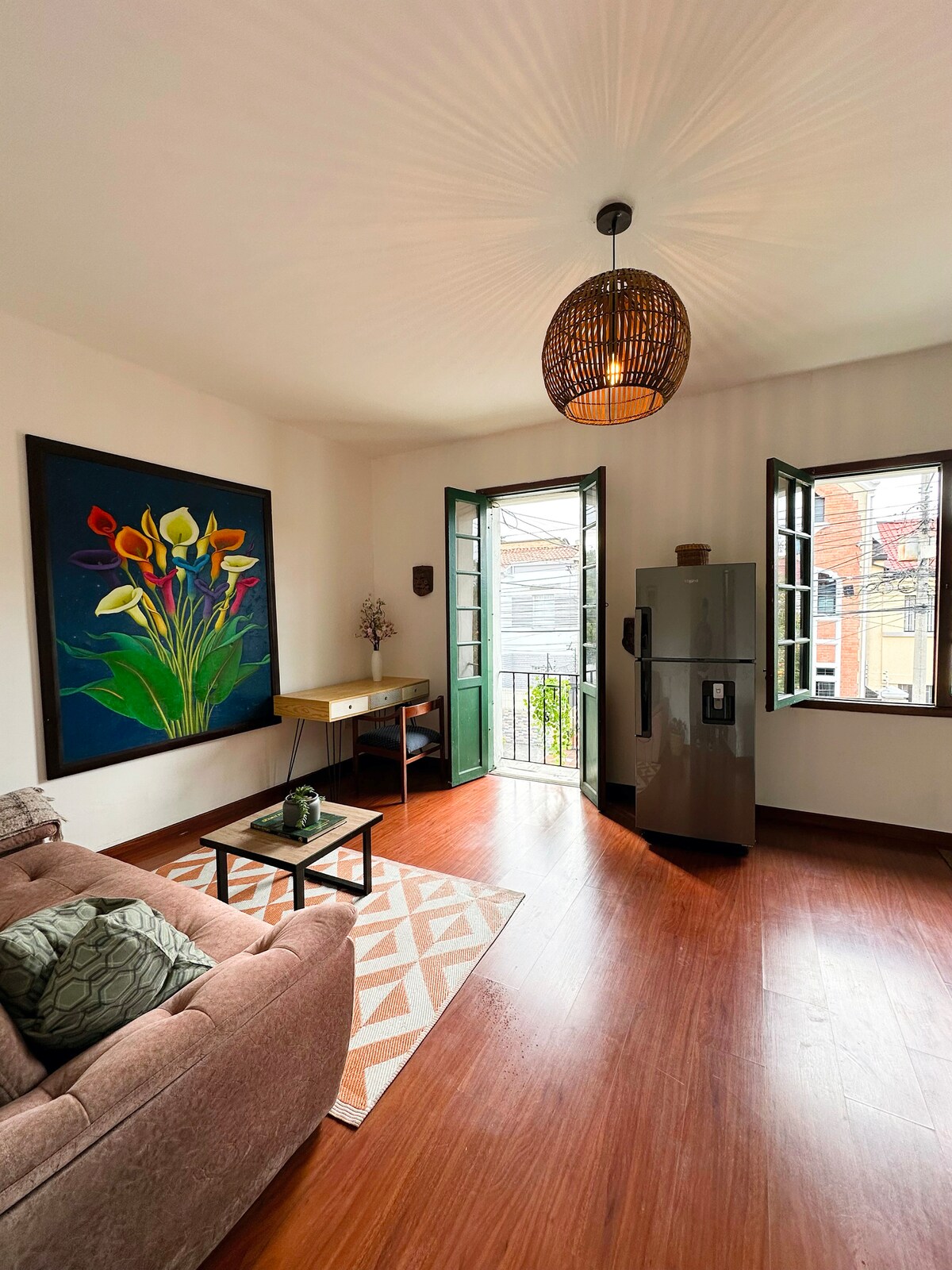 Lovely apartment in Chapinero, a central neighborhood close to shops, bars, and a 20-minute car ride to Bogotá's historical center. Situated within a spacious colonial house, the apartment occupies the second floor, while our mom resides on the first floor. The apartment is a two-floor duplex, flooded with natural light through large ceiling domes that provide mountain views. It is equipped with everything you need to make you feel at home. It is perfect for a long stay, a month or more.