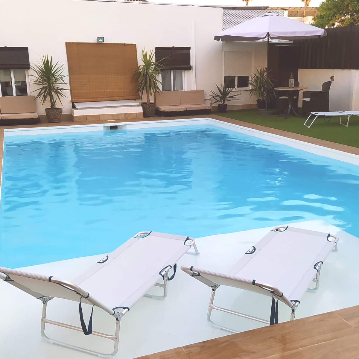 Opustite se i opustite u ovom mirnom i elegantnom domu. Probudite se iz dana u dan i opustite se u ovoj oazi mira, spavaća soba za dve osobe, kompletna kuhinja sa svim aparatima (mašina za pranje veša, mašina za pranje veša, mašina za sudove, mikrotalasna peć, aparat za kafu), kupatilo sa tuš kabinom, sušilica, klima uređaj, terasa, privatni bazen, privatni bazen,... Nalazi se u Aljarafeu, na 3 minuta od stanice Cercanías, na 15 minuta od centra Sevilje.