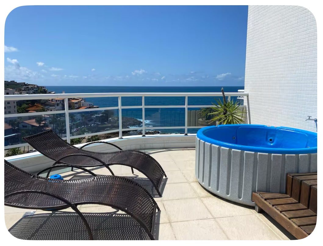 Cobertura Duplex com Hidromassagem privativa de última geração e churrasqueira, com a vista mais linda da cidade. Cobertura Bela Vista fica localizada no bairro de Ondina com vista vitalícia da melhor praia da região, ao lado Rio vermelho, com grande oferta de bares e restaurantes, além é claro, do principal ponto turístico salvador -Farol da Barra com seu famoso calçadão. Com uma vista Mar de tirar o fôlego, ela é espaçosa e com a estrutura completa para uma estadia e experiência Inesquecível