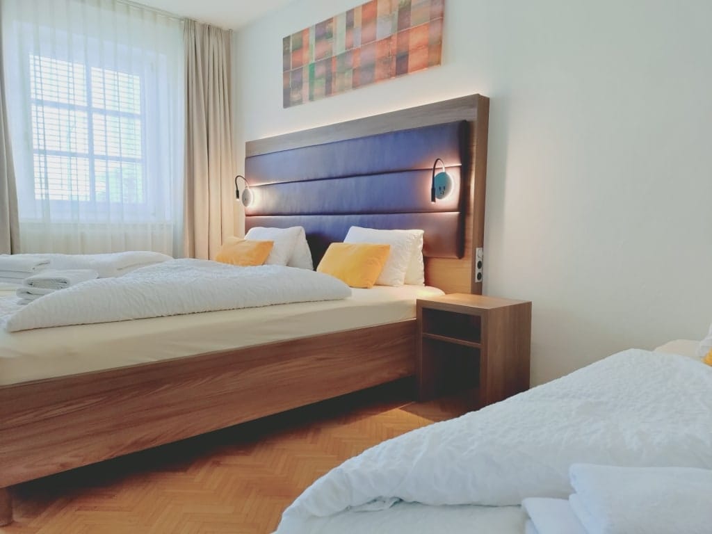 Udobno opremljena, a ipak pristupačna trokrevetna soba. Peškiri u sobi, zajednički tuš i WC u hodniku (zajednički samo za ovu sobu i još jednu!). Nalazi se na 1. spratu u našoj aneks zgradi (bez lifta) Približno 15 kvadratnih metara 2 kreveta za jednu osobu (svaki 0,80 m × 1,90 m) i kauč na razvlačenje Televizor, radni sto i prostor za odlaganje odeće Zavjese za zamračivanje Minibar Besplatan Wi-Fi Soba za nepušače Dodatna mikrotalasna rerna, kuvalo za vodu i mašina za pranje veša za zajedničku upotrebu.