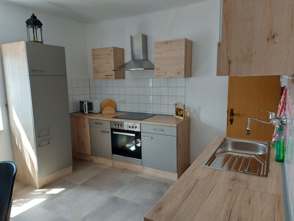 Die etwa 90 qm große Unterkunft liegt im ersten Stock eines 2-Familienhauses mit separatem Eingang. Zu Verfügung steht ein Schlafzimmer mit Doppelbett, sowie ein separates Zimmer mit etwas kleinerem Doppelbett (160x200 cm). Des Weiteren befindet sich in der Wohnung eine voll funktionsfähige Küche, sowie eine Waschmaschine. Wir freuen uns immer wieder neue Gäste willkommen zu heißen. Auch Biker sind hier herzlich willkommen!