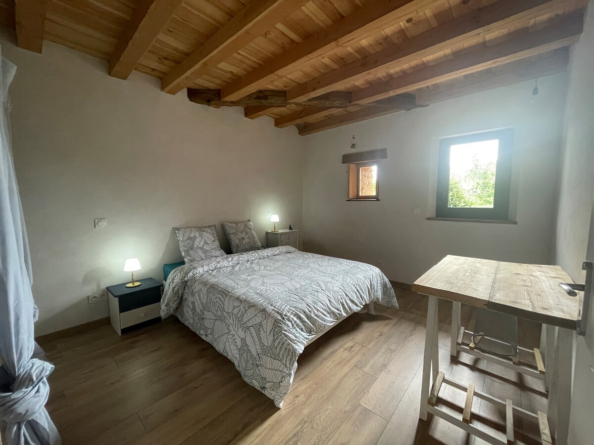 Notre logement se situe sur le coteau marmandais à 3 min en voiture du centre et à 2 min d’un supermarché . parking très spacieux . Havre de paix situé dans une longère vigneronne XIX ° de plain pied. Mitoyen de celui des proprietaires ce logement reste très indépendant . Netflix , canal+ , Fibre très haut débit permet télé travail Terrasse couverte ,2 chambres , lits confortables 140, salle de bains , wc , cuisine rétro avec four Espace nature libre ,ping pong, piscine ,, animaux