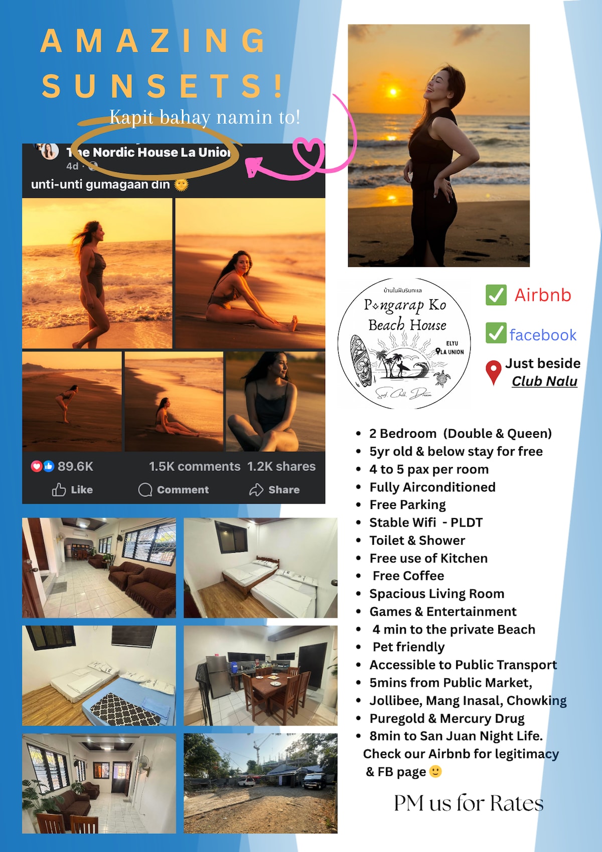 Doživite Surftown La Union na našem ekološki osviještenom Airbnb-u gdje je sve toplo samo prevrtanje i poprečni korak dalje! Mi smo vaši surfer domaćini i voljeli bismo da uživate u svom boravku i našoj plaži. Kao surferi, trudimo se da budemo što održiviji! Objavljena cijena je za 4 osobe, ali ova soba može da ugosti najviše 6 osoba. Cijena će se promijeniti nakon 4 osobe. Nalazimo se u živahnoj i rastućoj četvrti. Kao što je spomenuto, sve je samo preskok, skok i skok daleko!