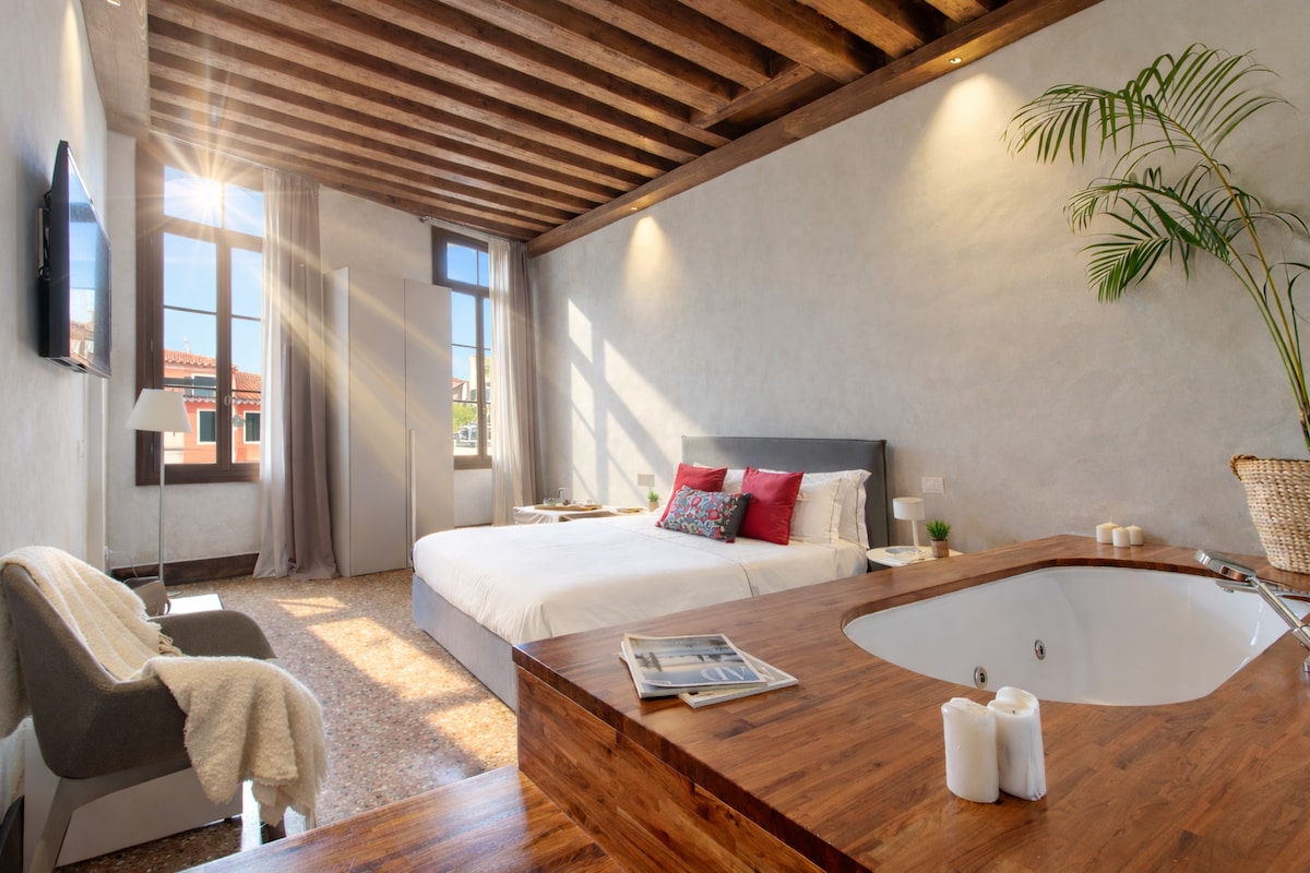 Soba BR. 5 - Dizajn i pogled na kanal - Dizajn potkrovlja za dve osobe opremljene svakom udobnošću. Odličan pogled na kanal Santa Marina. Moguć privatni pristup taksijem tokom dana. Ovo je savršena alternativa za boravak u hotelu u Veneciji. Udaljenost od trga Piazza San Marko i mosta Rialto. Pogled na marinu Rio di Santa i u blizini crkve čuda. Restorani, barovi, tipične venecijanske taverne i supermarketi udaljeni su svega nekoliko minuta hoda. NAPOMENA : NEMA PRIJAVE NAKON 19:00