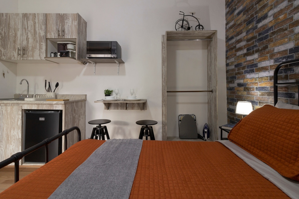 Beautiful suite Boutique concept furnished with antique touch but fully equipped. Heart of the historic center. Beautiful apartment located on pedestrian street in the best location in downtown w/ amazing private rooftop terrace. The apartment sleeps 2 people is fully equipped with private bathroom, kitchen and dining area. Walking distance to everywhere in downtown Queretaro. The place is clean quiet and full of design. Nice terrace Safe box Bathroom Queen size bed Dining room Living room 49