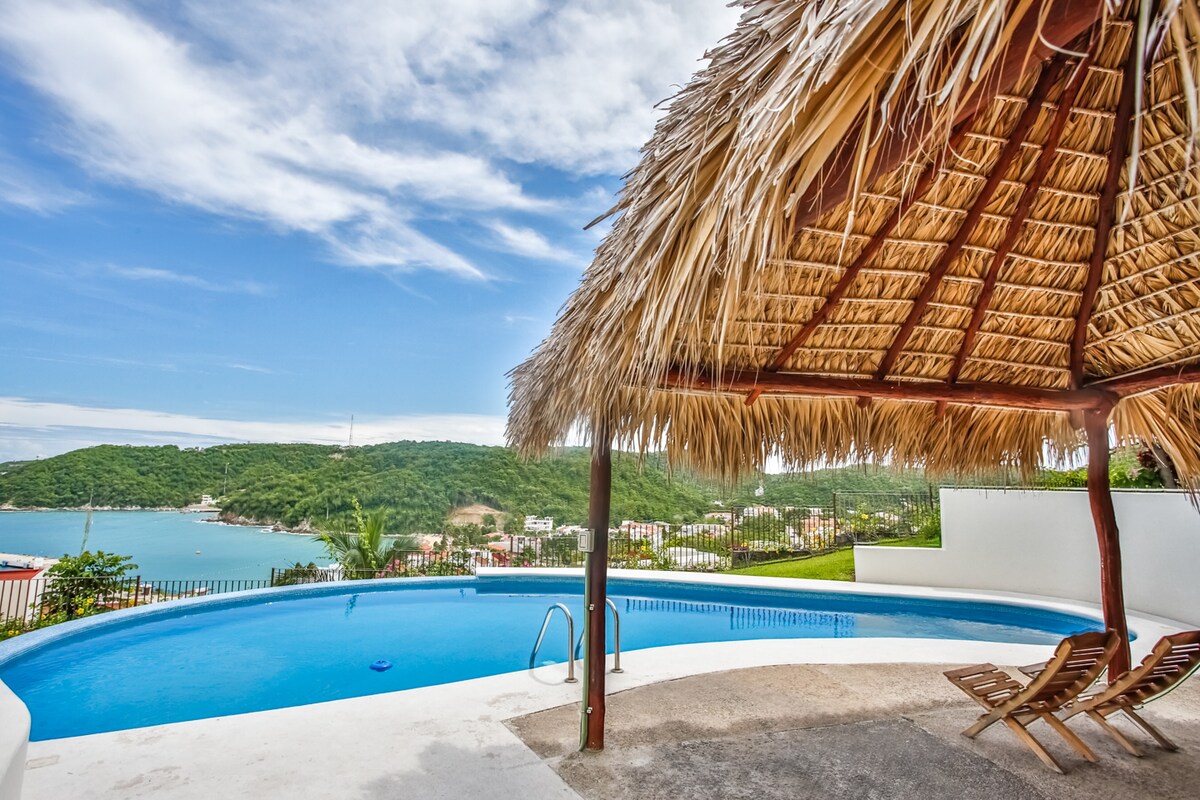 Punta Paita Villa! 3 spavaće sobe s pogledom na impresivan pogled na zaliv Tangolunda i ostrva. Izuzetno impresivan detalj u arhitekturi i uređenju okoliša u cijelom objektu. Sve sobe imaju klimu, Wi-Fi i privatna kupatila. Udobna trpezarija pored bazena i udobnih enterijera u kojima se možete opustiti i zabaviti. Spava 7 osoba. Dnevna usluga sobarice i javni pristup prelepom zalivu manje od 10 minuta hoda niz put. Pitajte za naš sestrinski objekat za više prostora!