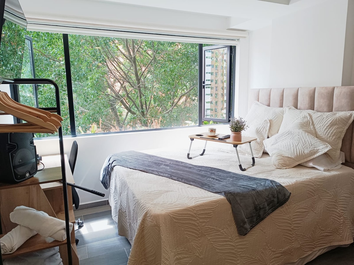 - Privilegovana lokacija: u srcu četvrti Laureles, u blizini stanica metroa, stadiona, supermarketa, restorana i ulice 70. - Odličan balkon s pogledom na grad - Wi-Fi (300 MB) s optičkim vlaknima - Klima uređaj - privatna hidromasažna kada - Osoblje na licu mjesta non-stop, spremno da vam pomogne sa svime što bi moglo da vam zatreba. - Smart TV 43”, sa instaliranim aplikacijama. - Kuhinja opremljena posuđem, loncima, kašikama, noževima. - Bračni krevet (1,60mt x 1,90) - Transparentne cijene (vidi pravila)