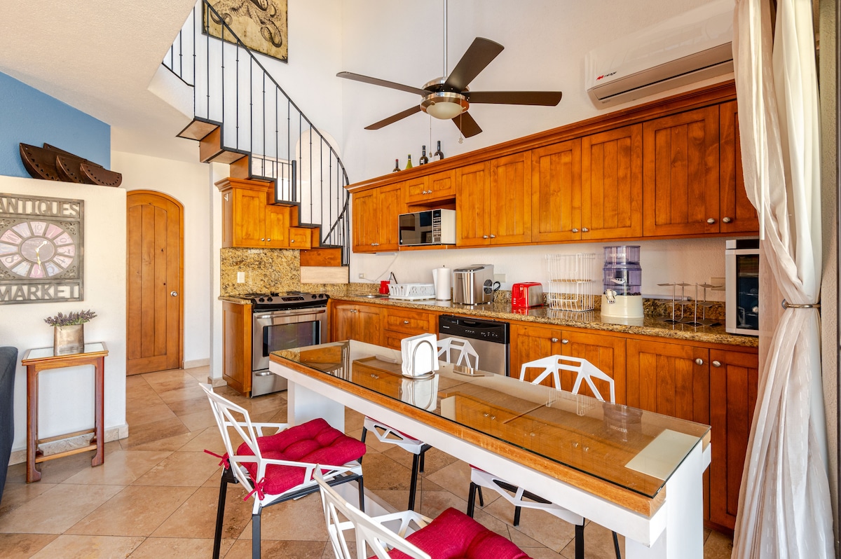⭐️Relax and enjoy your spacious & spotless home with terrace ♥️ In the heart of San Jose del Cabo Resort Zone. Steps to beach, Historic Center, restaurants, bars, shops & fun! Book with confidence, you’ll be in the best LOCATION! Nice complex La Costa Phase 3 with 3 pools, 2 jacuzzis & free parking! Enjoy the lovely ambience in your terrace overlooking the Golf Course & mountains. Fully equipped & beautifully decorated 🥰 Big TV screen, fast wifi, laundry & BBQ! Airport transportation available.