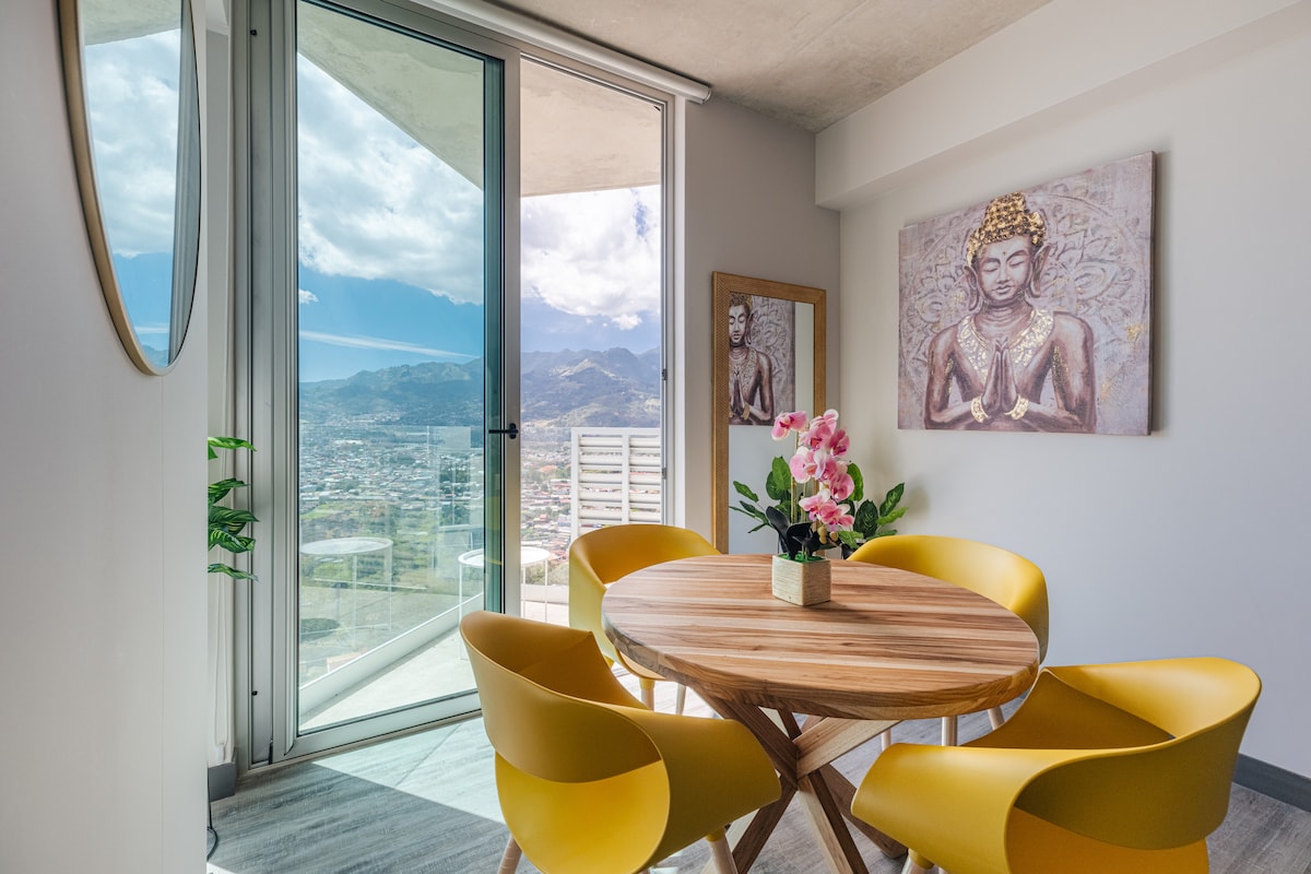 Vive la experiencia de hospedarte en un apartamento único en el piso 29 de torre Secrt Sabana , con una vista panorámica impresionante de las montañas de San José , a solamente 200 metros del Parque Metropolitano de la Sabana (mejor ubicación en San José) disfrutarás de sus más de 20 amenidades, te vas a cautivar por los detalles decorativos que verás en cada rincón. ***Aeropuerto Juan Santamaria a solamente 10 millas***
