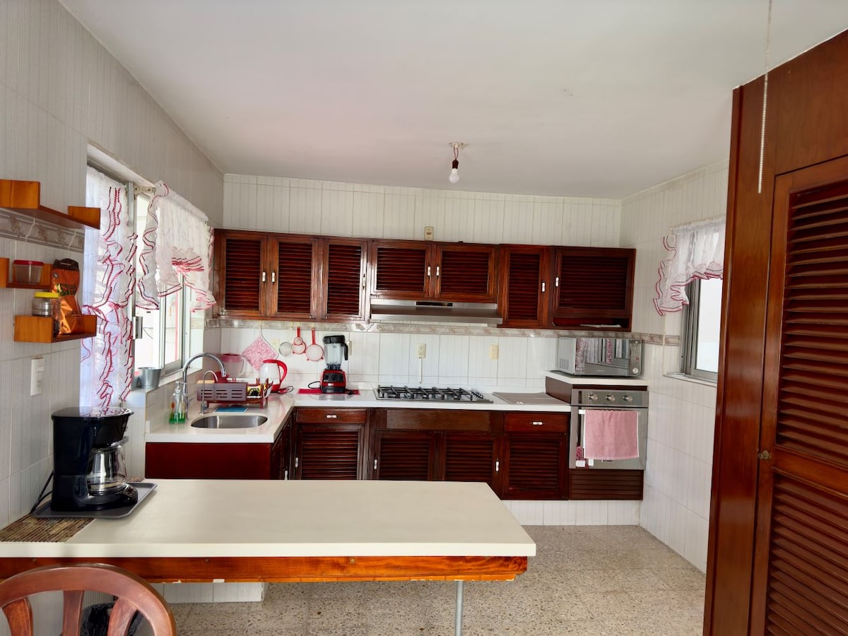 Situada en céntrico y tranquilo vecindario, a dos cuadras del acuario. Hermosa propiedad de dos pisos, muy amplio jardín y cochera para un carro. Tres habitaciones con aire acondicionado, dos baños enteros, un medio baño y un baño entero de servicio; sala, comedor, desayunador y terraza. Cuenta con cocina integral, refrigerador, horno de microondas, cafetera, una television, lavadora y señal de wi-fi.