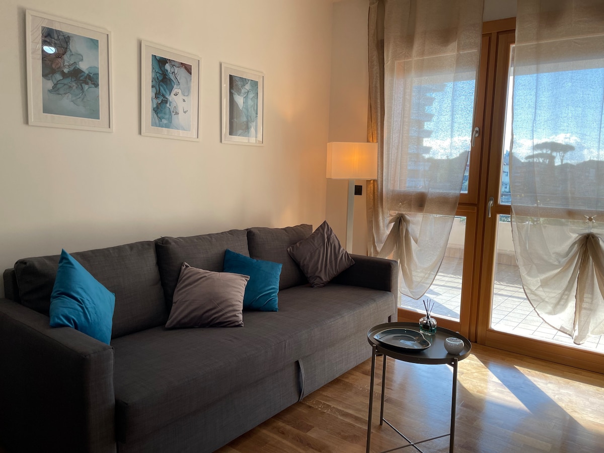 Udoban dvosobni stan, sa besplatnim unutrašnjim parkingom, opremljen na moderan i funkcionalan način za bilo koju vrstu putnika. Nalazi se na strateškom položaju na pola puta između mora i centra Rima i 15 minuta vožnje od aerodroma FCO; nekoliko koraka od autobuske stanice 777 i 078 koje vode za nekoliko minuta do stanice Tor di Vale (voz Rome-Lido) koja povezuje centar sa morem. Tu su i sadržaji kao što su supermarketi, apoteke, restorani, barovi, prodavnice. Takođe je odlično za odmor