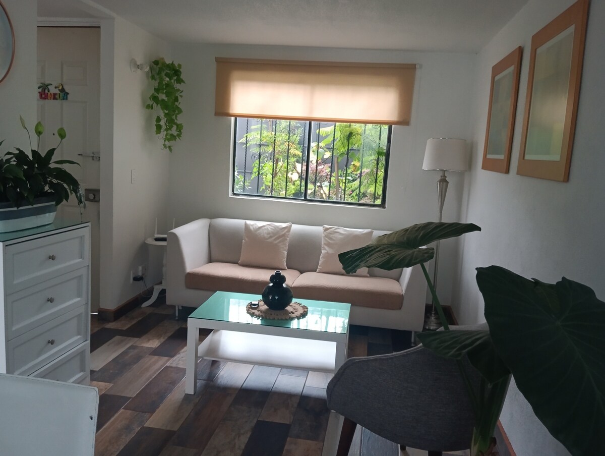 Udoban šumski APARTMAN, pogled na prirodu, vulkani, grad, nebo. Planinska magija. Dimnjak. Opustite se i uživajte u bezbjednom okruženju, 1100 m iznad Meksiko Sitija. 40 minuta od Interlomasa i Toluke. Idealno za putovanje sa ljubavlju, porodicom ili prijateljima. Pronađite inspiraciju, pješačite, napravite domaći zadatak ili se prilagodite nadmorskoj visini za takmičenje. Sunčano brdo. Područje za seoske kuće sa nadzorom, u blizini novog autoputa. Dnevni boravak, kamin, trpezarija, čajna kuhinja, 2 spavaće sobe, 2 kupatila, topla voda, roštilj, ekran, Wi-Fi.