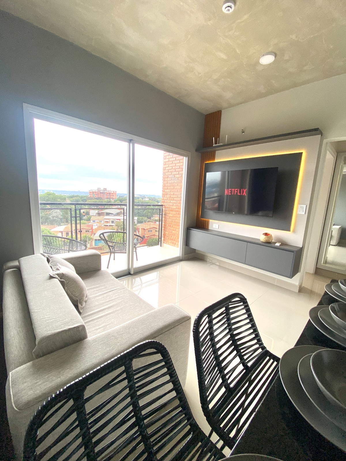 Stay in the best area of Asunción, just steps from Paseo La Galería and Shopping del Sol. This 15th-floor luxury apartment offers panoramic views, a cooled queen bed, 65" NeoQLED TV with sound system, and a fully equipped kitchen ideal for long stays. Enjoy access to spa with sauna, Jacuzzi, massage room, rooftop pool, gym, co-working, reading lounge, playroom, BBQ area, valet parking, and 24/7 security in a premium high-rise.
