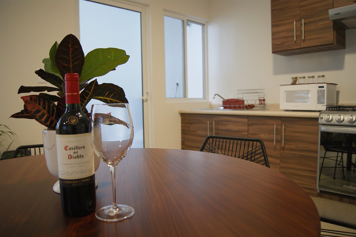 HERMOSO DEPARTAMENTO, AMPLIO, COMODO, SIN ESCALERAS. SOLO PARA AUTOS MEDIANOS. GRAN CLASE Y ESTILO TOTALMENTE EQUIPADO. CONSTA DE UNA AMPLIA RECAMARA CON ESPACIO PARA TRABAJAR EN TU COMPUTADORA, WIFI, PANTALLA, BAÑO COMPLETO PRIVADO Y UN AMPLIO VESTIDOR. SALA CON SOFA CAMA, COMEDOR Y COCINA EQUIPADA CON CAFETERA, TOSTADOR, LICUADORA ETC. 1 MEDIO BAÑO. ADEMAS DE UNA PEQUEÑA Y MUY AGRADABLE TERRAZA, Y COCHERA CON PORTON ELECTRICO PARA AUTO MEDIANO.