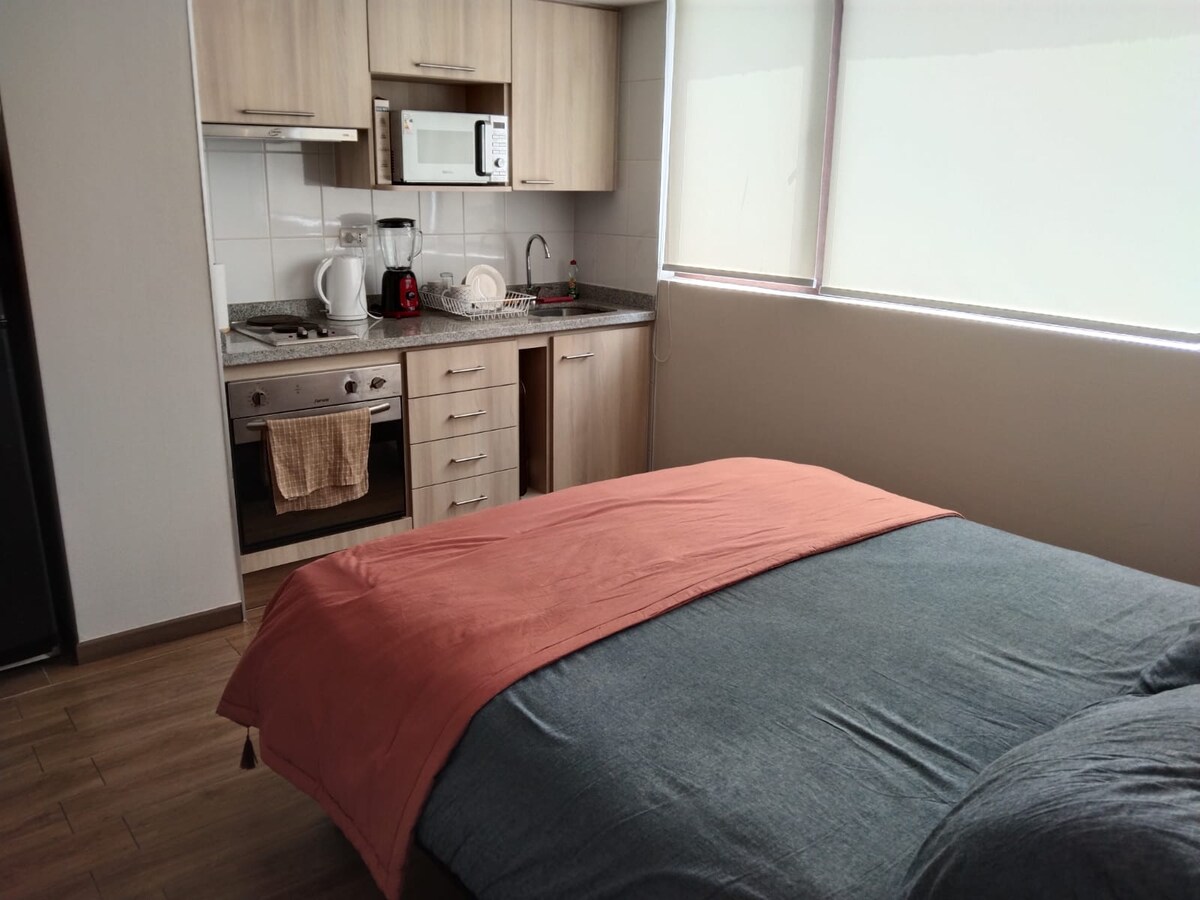 Disfruta de una experiencia con estilo en este alojamiento céntrico, cómodo y full equipado: - Ideal para 2personas - 1 cama queen + 1 futón - Wifi, SmartTV+3000canales(fútbol incluido)Netflix - Cocina full equipada. El edificio ofrece gimnasio y sala de cowork. A 3min del terminal, estadio, universidades, lavandería, farmacias y supermercados. Con locomoción a la puerta, conectividad ideal. Cuenta con conserjería 24/7. Perfecto para descansar, trabajar o explorar la ciudad.