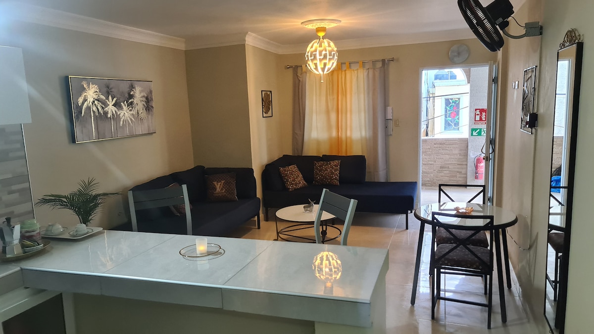 Vive la experiencia de un espacio moderno y céntrico, a solo dos calles del Estadio Tetelo Vargas y supermercados locales y a 15 minutos de las hermosas playas de Juan Dolio. El apartamento ofrece aire acondicionado tanto en la sala como en el dormitorio, que cuenta con una cómoda cama king size, mientras que la sala dispone de un sofá cama full. Además, disfrutarás de Wi-Fi, una cocina totalmente equipada y un área de lavado, diseñado para que tengas una estadía cómoda e inolvidable.