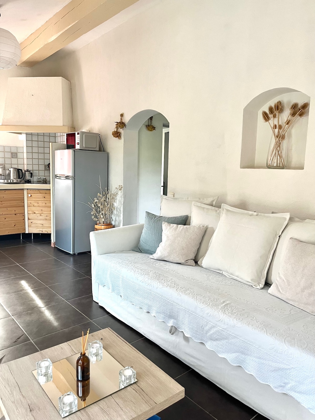 Nestled against the hillside with commanding and unobstructed views of the vineyards, we are delighted to welcome you to Ness Cottage. A beautiful, cozy, and comfortable 55 m² suite, elegantly decorated and full of character, nestled in a peaceful countryside setting with a swimming pool. This accommodation, rated 5 ⭐️ for furnished accommodation, features a cozy bedroom with its own dressing room, a large living room, a kitchen, and a bathroom with a toilet. Paradise exists, it's here ! 🏞️🐠🌅