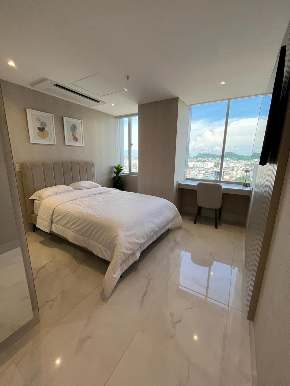 The apartment has been completely renovated. White is the predominant color in the apartment giving the sensation of amplitude and freedom. Decoration is minimalistic, with wood like finishes on the floor, teak doors, beds and nightstands. The view is amazing overlooking Santa Ana Hill, the Guayas River and the city. There is 24h reception in the building, and security cameras everywhere, very safe area and building.